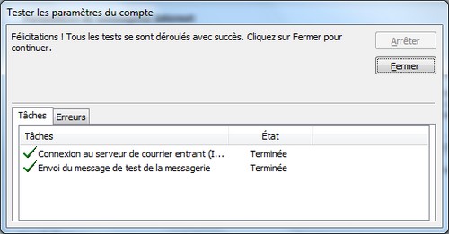 Validez ces paramètres et fermer la fenêtre de paramètres avancés. Cliquez ensuite sur suivant pour valider les paramètres et tester les paramètres du compte. Une fenêtre de vérification apparaît. Si une fenêtre d'avertissement de sécurité apparaît, cliquer sur Oui :